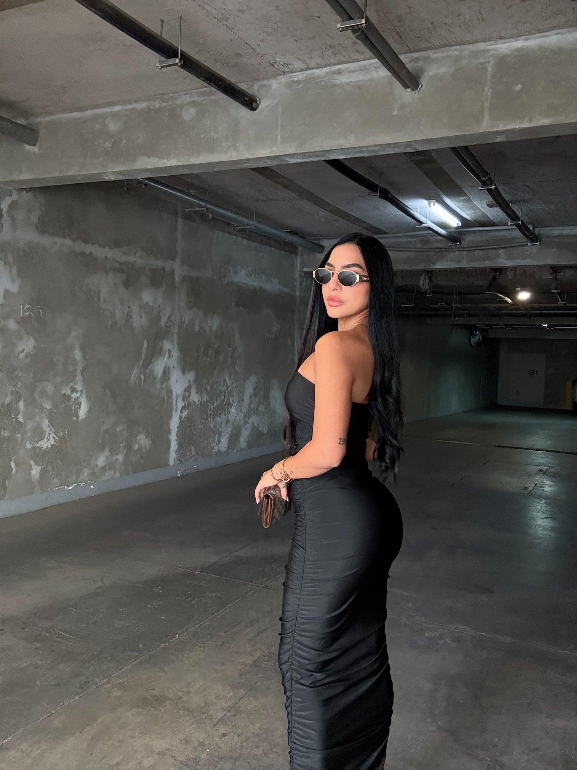 diseño de tubo strapless y escote con leve abertura en forma de gota.